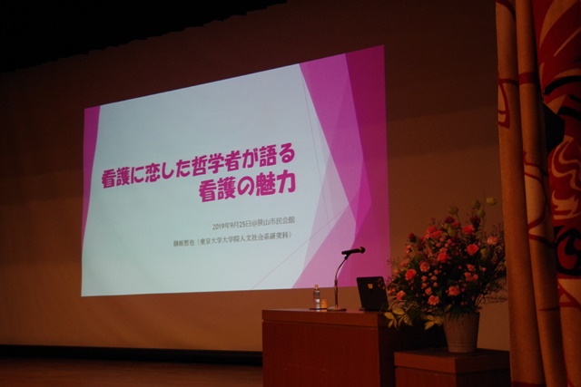 講師に哲学者の 榊原哲也 先生をお迎えして『看護に恋した哲学者が語る看護の魅力』と題して講演会を開催しました。 入間看護専門学校の学生の他、入間市・狭山市の准看護学校の学生も参加しました。